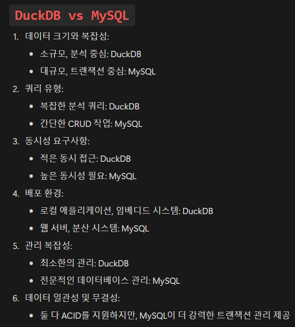1) 분석 중심: DuckDB는 OLAP(Online Analytical Processing) 워크로드에 최적화되어 있다.