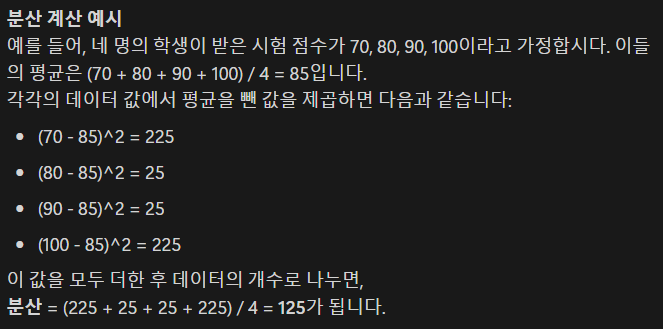 분산은 각 데이터 값에서 평균을 뺀 값을 제곱한 후, 이를 모두 더하고 데이터의 개수로 나누어 계산한다.