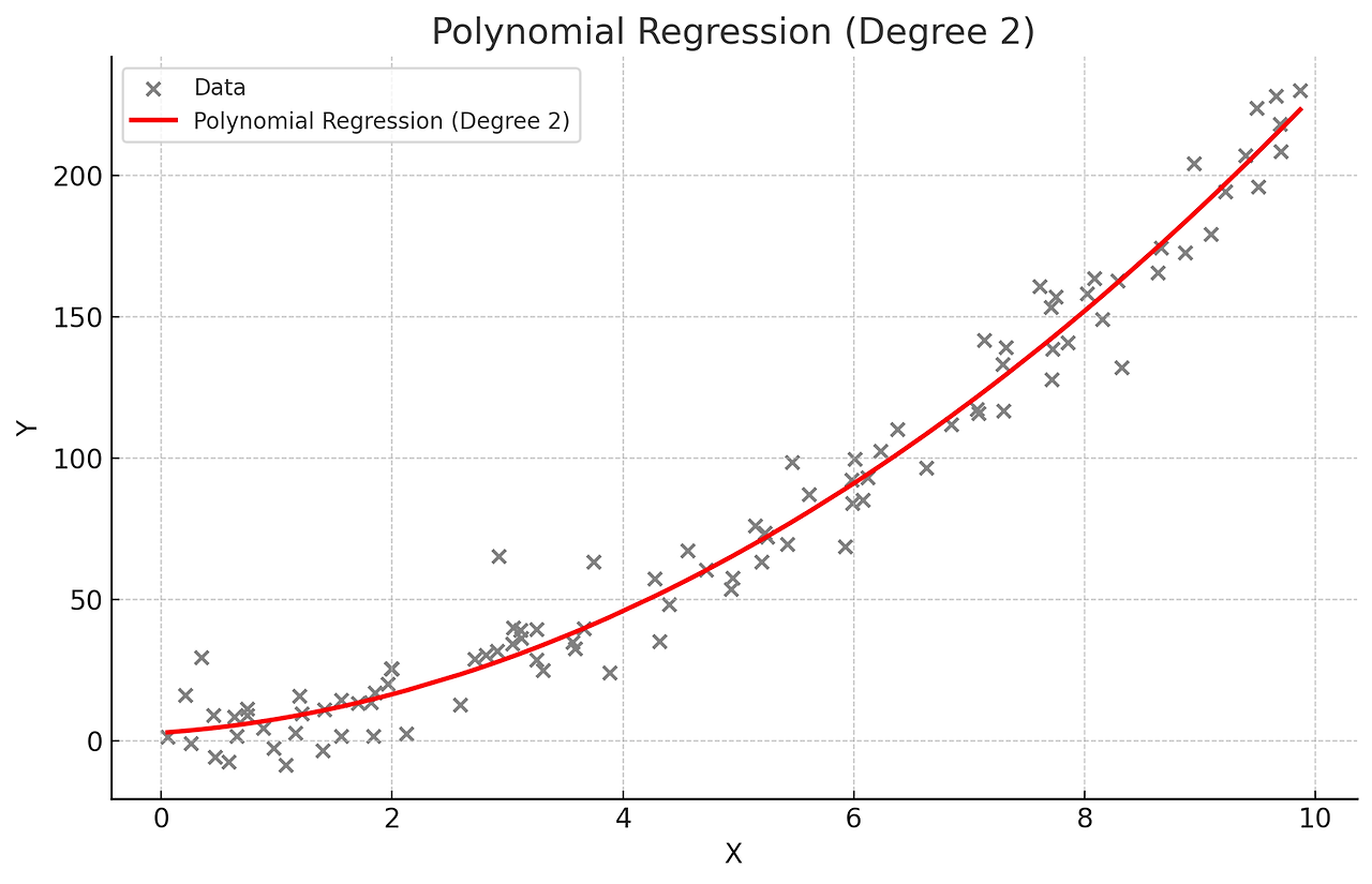 독립 변수와 종속 변수 간의 관계가 선형이 아닐 때(데이터가 곡선적 경향을 따를 때) 사용한다. 독립 변수의 다항식을 사용하여 종속 변수를 예측한다. 비선형 관계를 모델링할 수 있으며 고차 다항식의 경우 과적합(overfitting)위험이 있다.