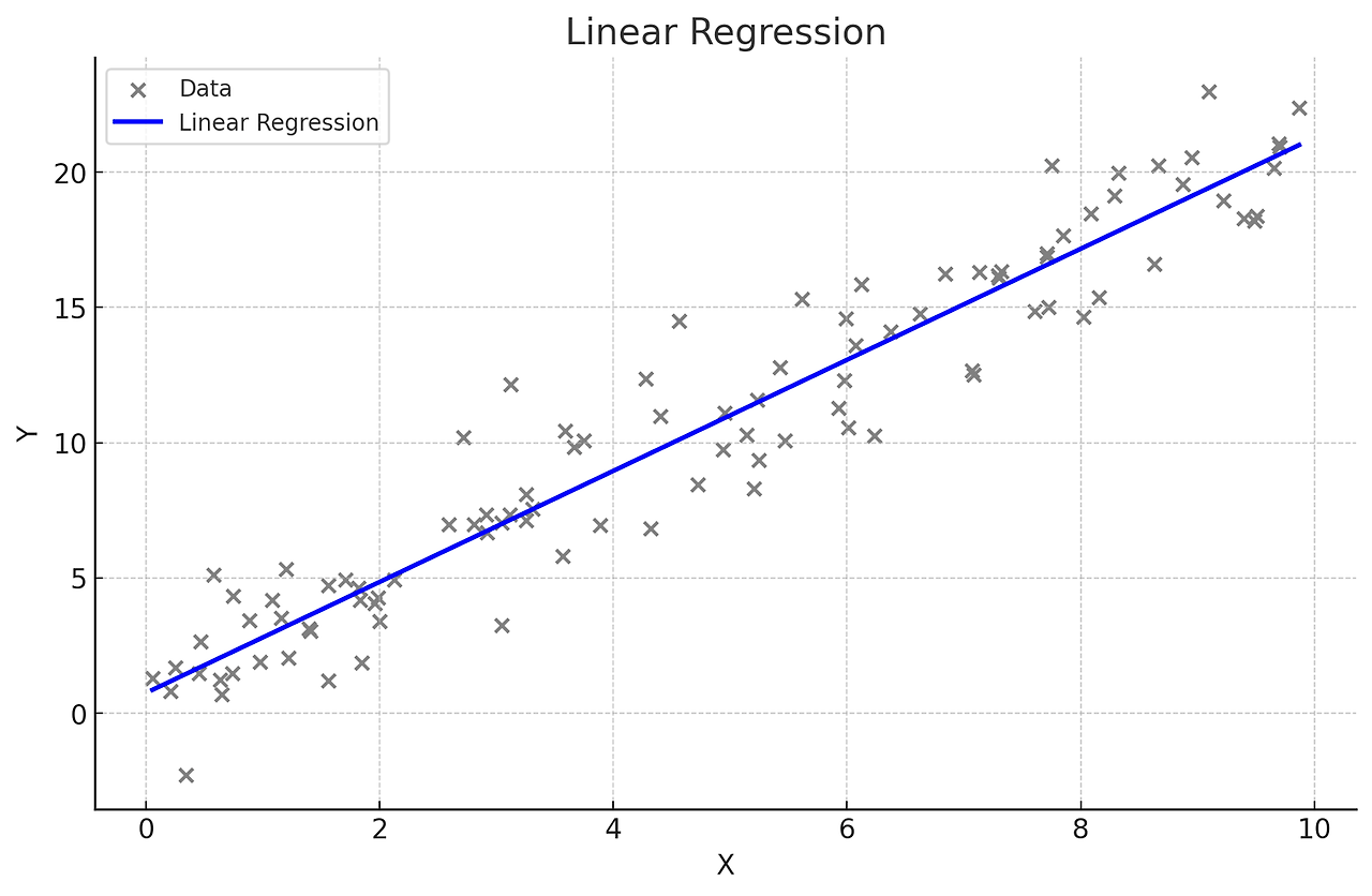 하나의 독립 변수(X)와 하나의 종속 변수(Y)간의 관계를 직선으로 모델링하는 방법으로 간단하고 해석이 용이하여 데이터가 선형적이지 않을 경우 적합하지 않다.