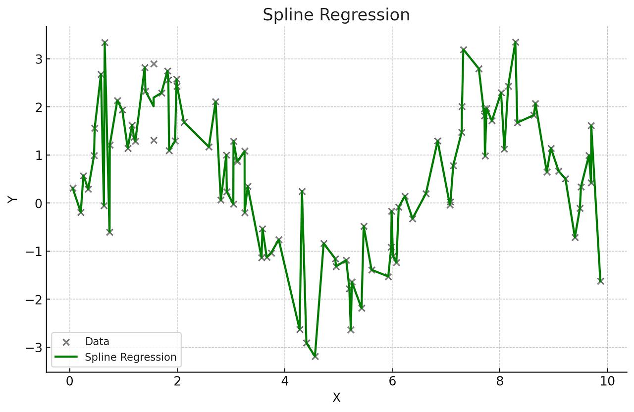 독립 변수의 구간별로 다른 회귀식을 적용하여 복잡한 관계를 모델링한다. 구간마다 다른 다항식을 사용하여 전체적으로 매끄러운 곡선을 생성한다. 때문에 데이터가 국부적으로 다른 패턴을 보일 때 사용하여 복잡한 비선형 관계를 유연하게 모델링할 수 있다..