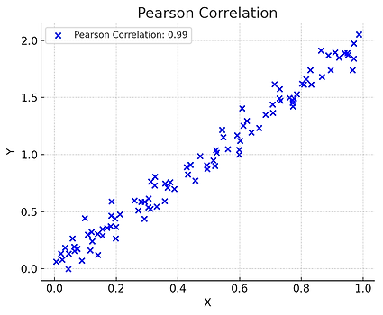 두 연속형 변수 간의 선형 관계를 측정하는 지표로 -1에서 1 사이의 값을 가진다. 1은 완전한 양의 선형, -1은 완전한 음의 선형, 0은 선형 관계가 없음을 의미한다.