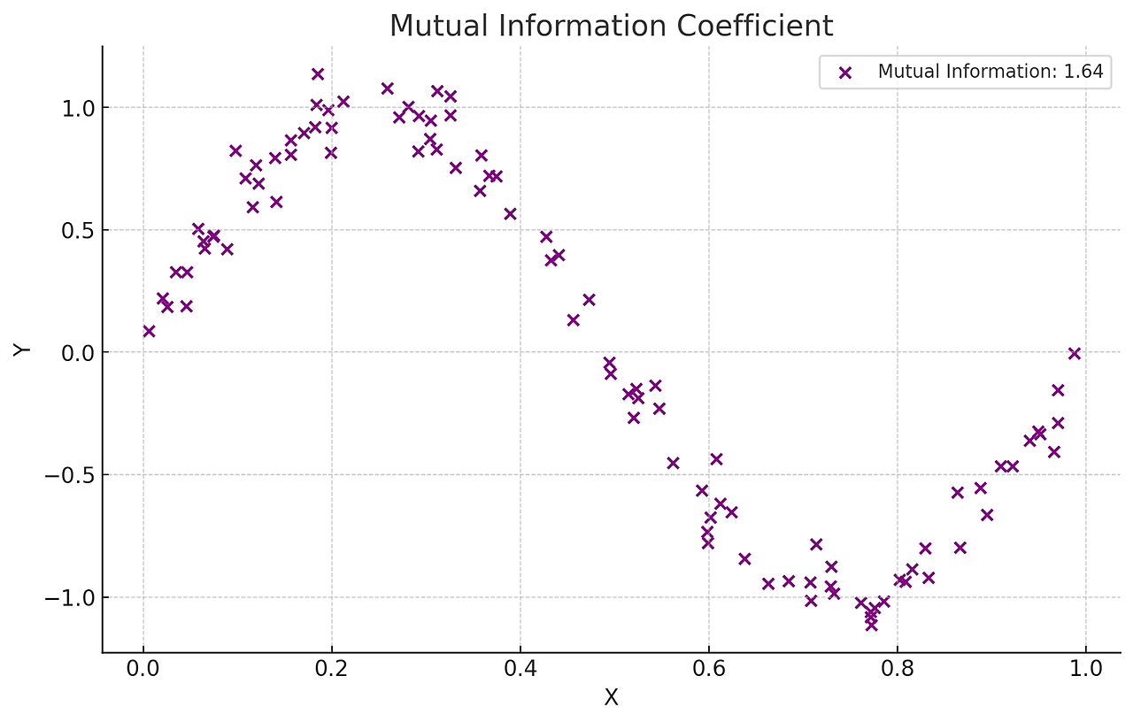 변수 간의 정보 의존성을 바탕으로 비선형 관계를 탐지한다. 서로의 정보에 대한 불확실성을 줄이는 정도를 바탕으로 계산하며 범주형 데이터에 대해서도 적용 가능하다.